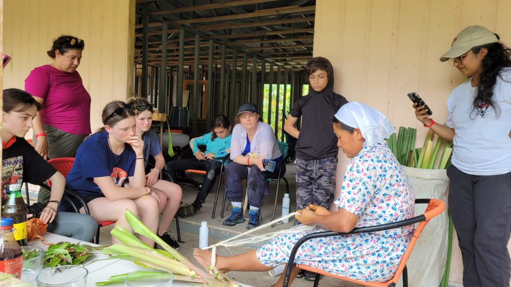 Day 2 of our hands-on Marine Zoology and Oceanography class workshops in Panama found us all at my property– Ojo Bio– again! Oceanography students worked on graphing tidal charts of Almirante Bay to see the changes over the course of ten days. They then used that information to make a prediction at 9am of where the tide line would be at 3pm when we left for the day! This required some serious critical thinking and math skills to mark the exact spot on their pole, then put it in the water and wait for the results! They did great!! Then we headed into the mangrove forest to discuss all of the adaptions of the 3 species of mangroves we learned about this year, and to see real life examples of those adaptations and how they affect positioning within the intertidal zone. Because I firmly believe in child labor, I then put them to work in our mangrove nursery!! They went out into the muddy mangroves to collect propagules (baby mangroves) and put them in bags to go into our mangrove nursery. Soon, those plants will be reforesting lost mangroves in the archipelago! Marine zoology students went through our database of 119 reef species documented on our coral reef. We looked at pictures, discussed their taxonomic placement, and adaptations of many of the animals. We then used knowledge from our year long class to create a dichotomous key for some of the species they might find. I then threw them off the dock so they could snorkel and observe all of the creatures up close and personal! Snorkeling is so much more meaningful when you know WHAT you are looking at!! We finished off with a stroll through the mangroves, learning about each species, its adaptations, and its benefits to the ecosystem (and us). As we focus on animals in this class, they needed to get up to speed on these important trees for a trip we’re taking in a few days! When the students weren’t in science, they were with some of our local Ngabe indigenous tribe members, learning how to make traditional bags. They extracted fibers from a plant and learned how to roll the fibers into string. Then, using natural dyes, they were able to color their strings. They then witnessed the extremely tedious process of hand tying each string to make these amazing bags! Wet, muddy, engaged kiddos learning about science and culture…that’s what we love at Next Level Homeschool and Ojo Bio!